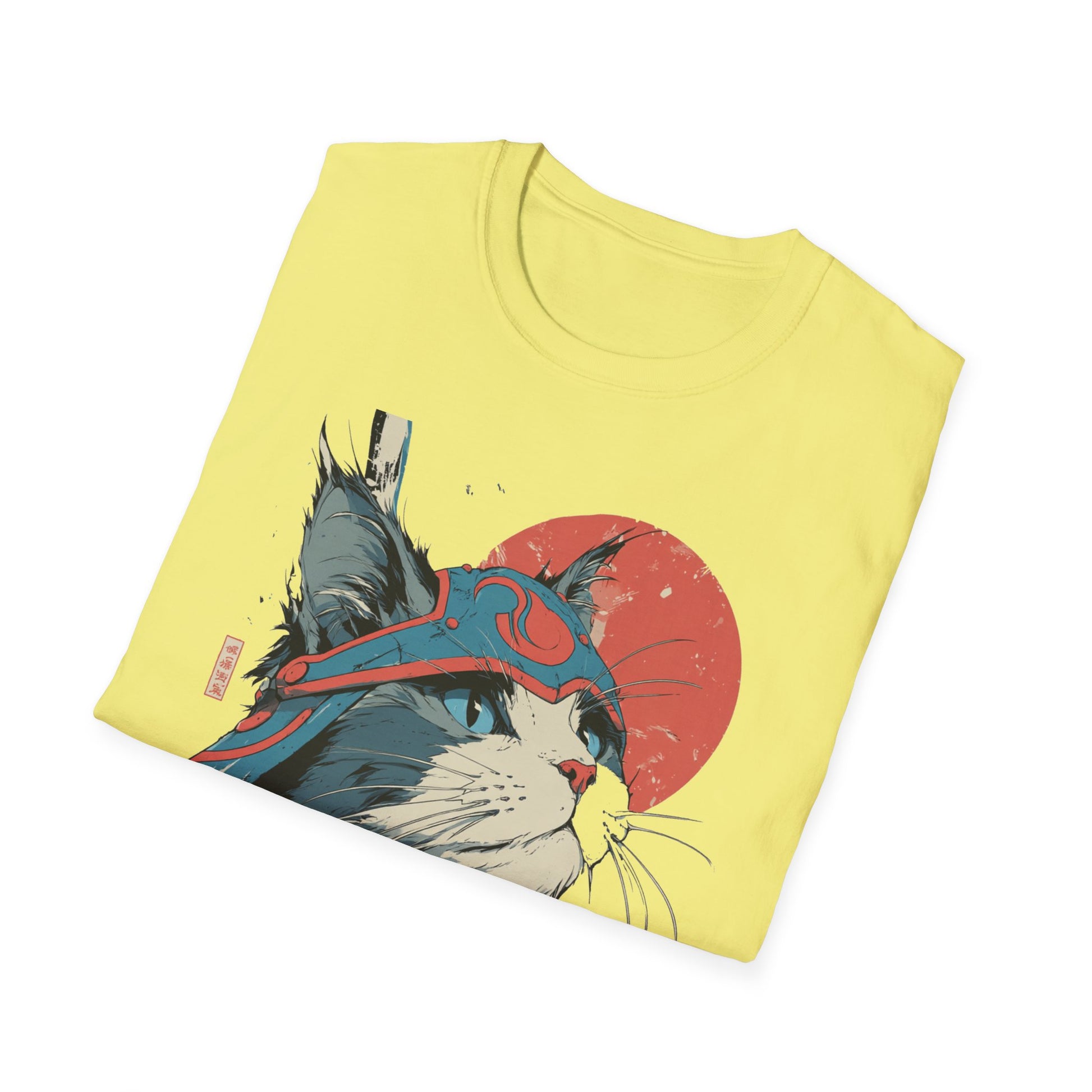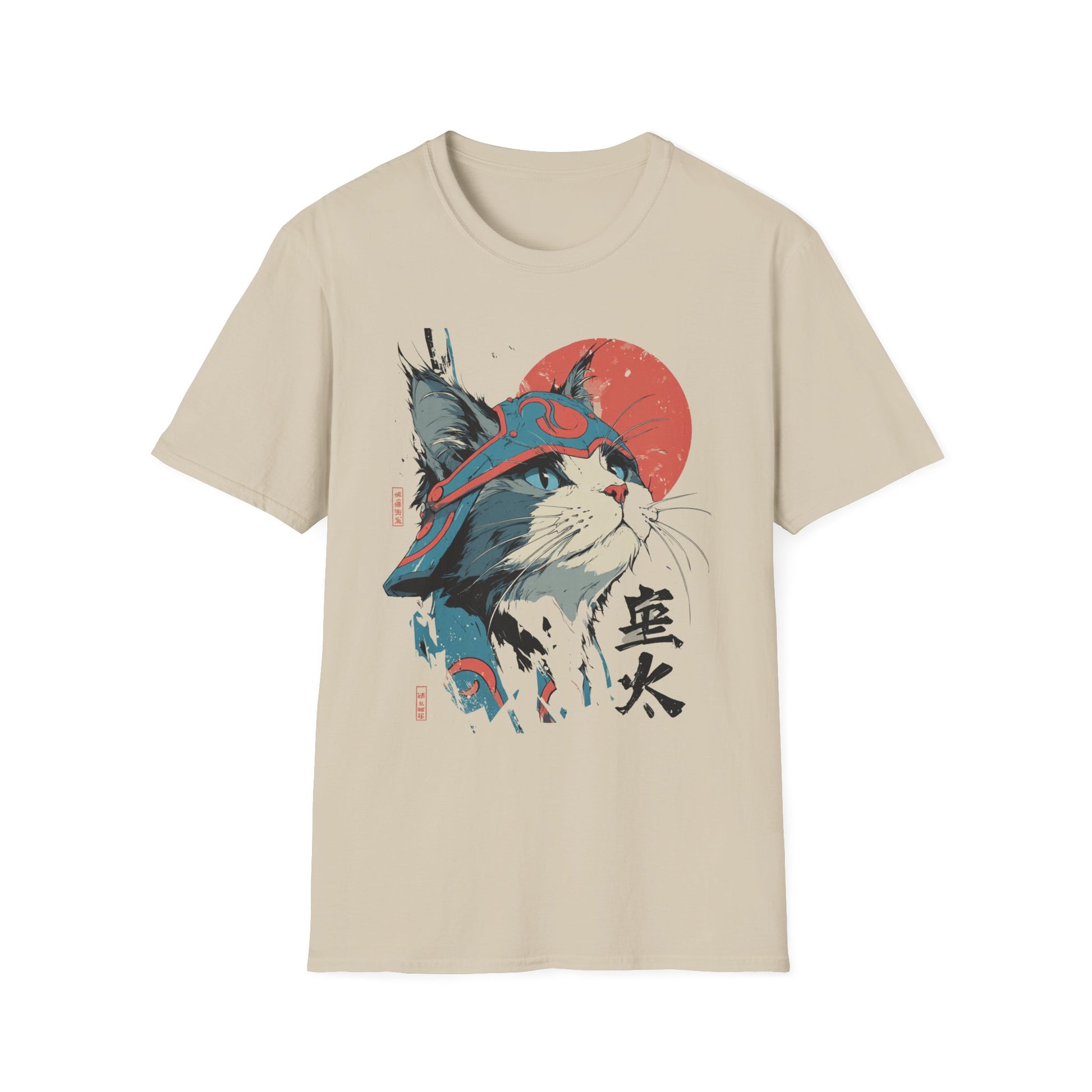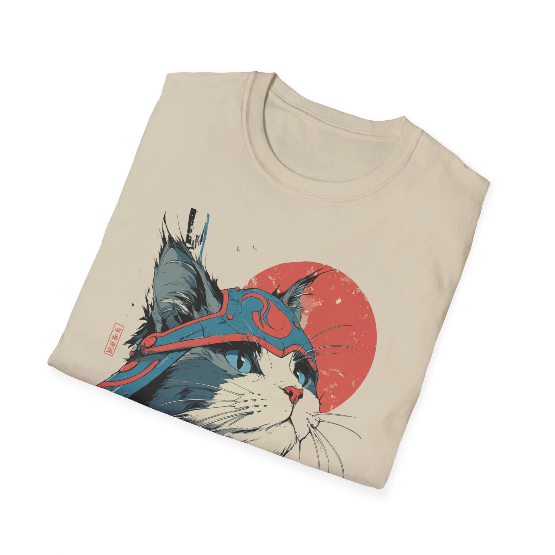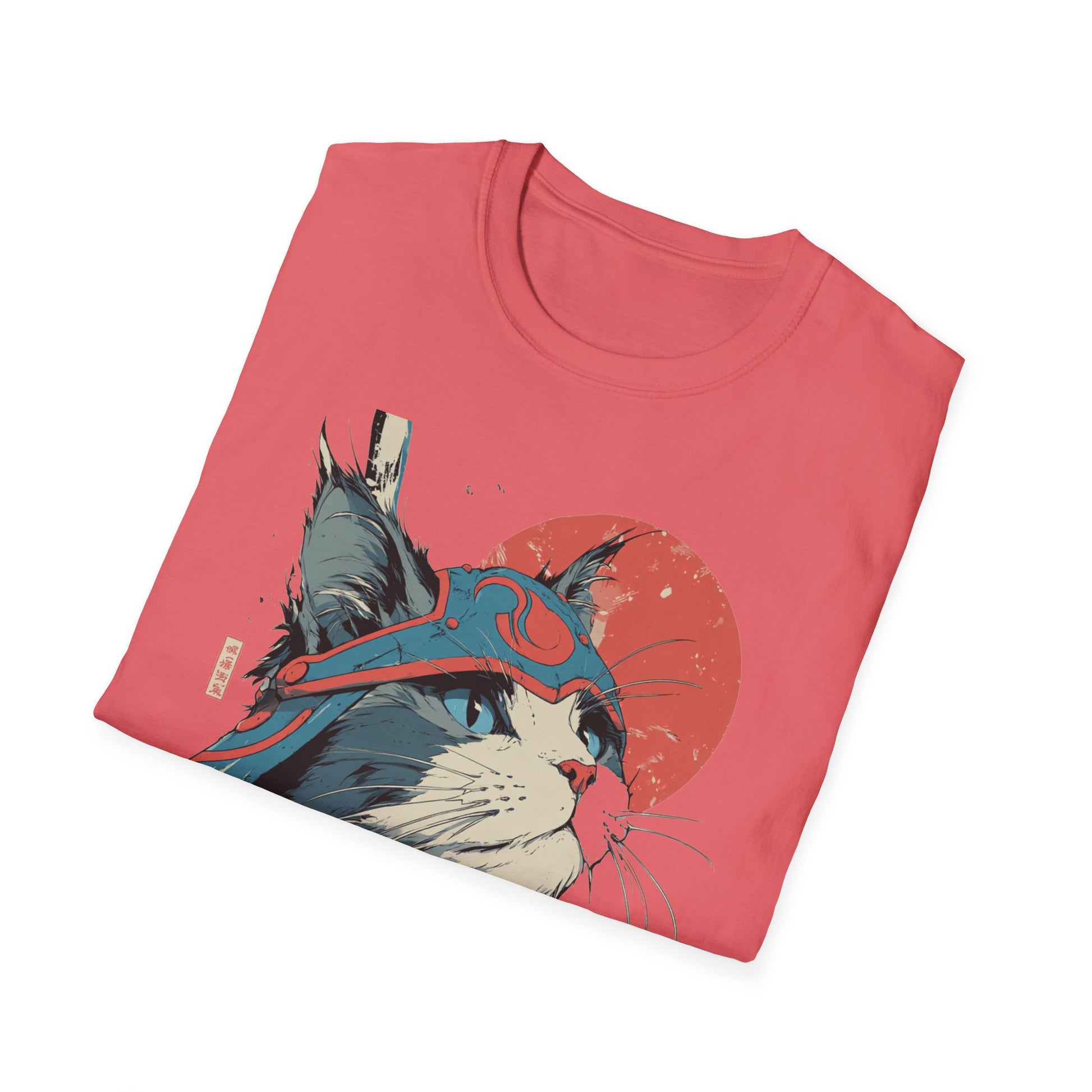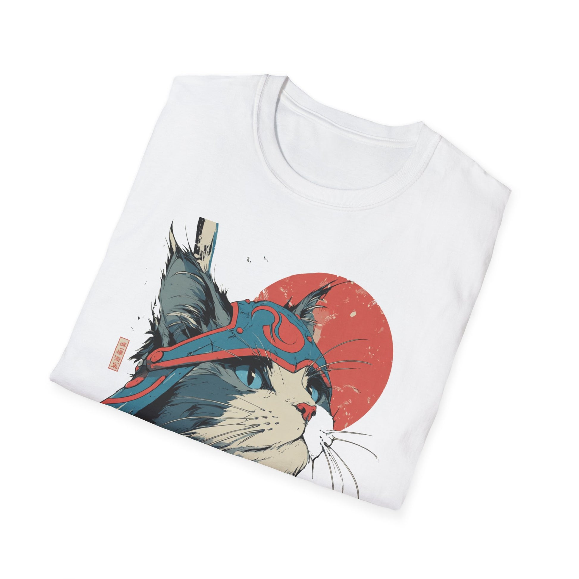 A lightweight, ring-spun cotton tee featuring a bold, samurai-inspired cat illustration—striking reds and muted teals set against a clean white canvas. The artwork pairs Japanese kanji and a rising sun motif with hand-drawn brush textures, creating a balance of playful charm and quiet strength. Wear it to add an artful, street-style edge to everyday outfits or to layer under a jacket for conventions, meetups, or casual nights out. The soft fabric and classic crew neck make it comfortable for long days while the tear-away label and reinforced shoulder tape keep the fit feeling fresh wash after wash.