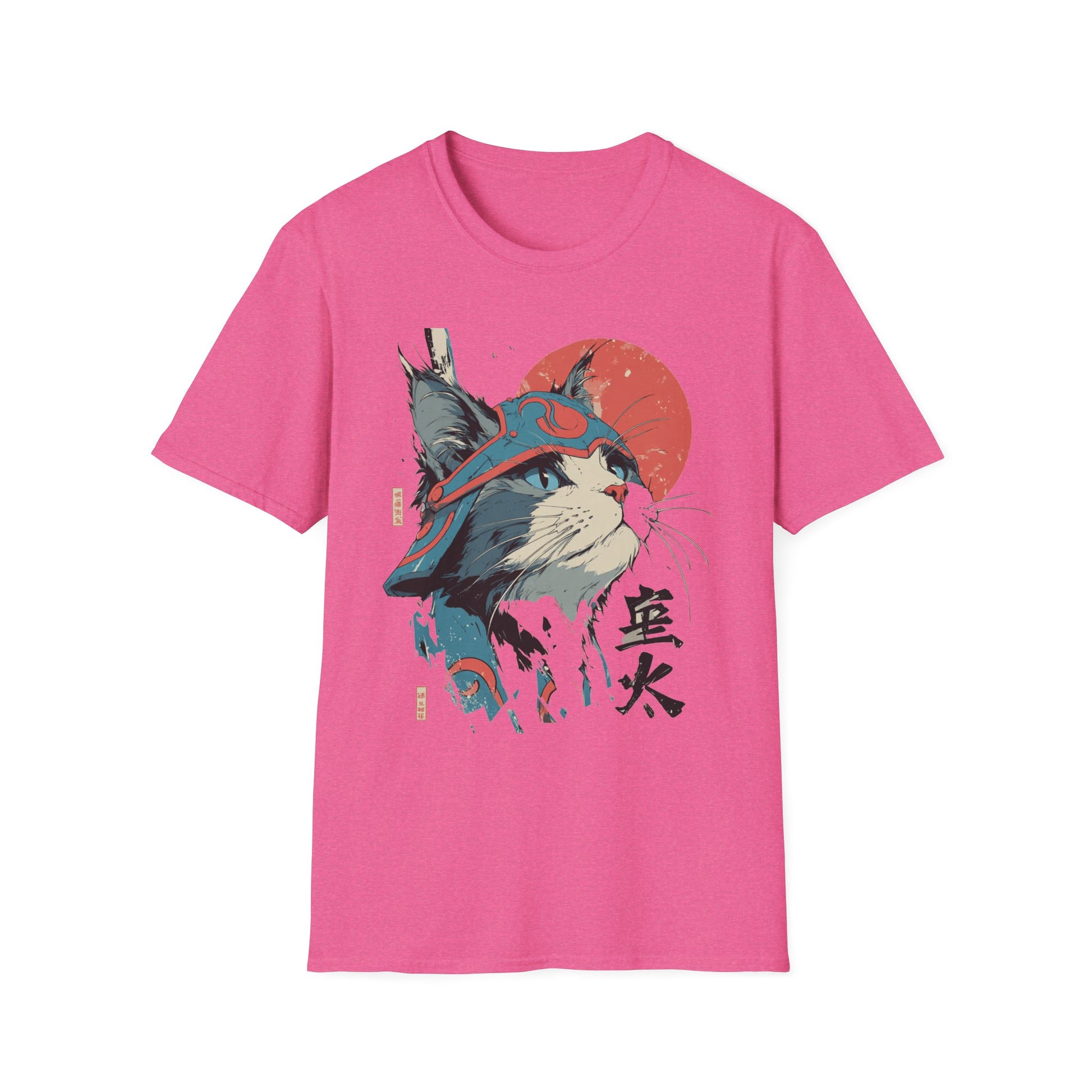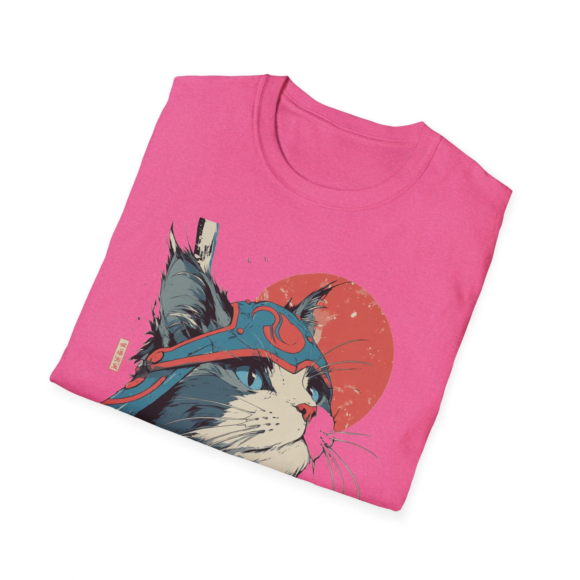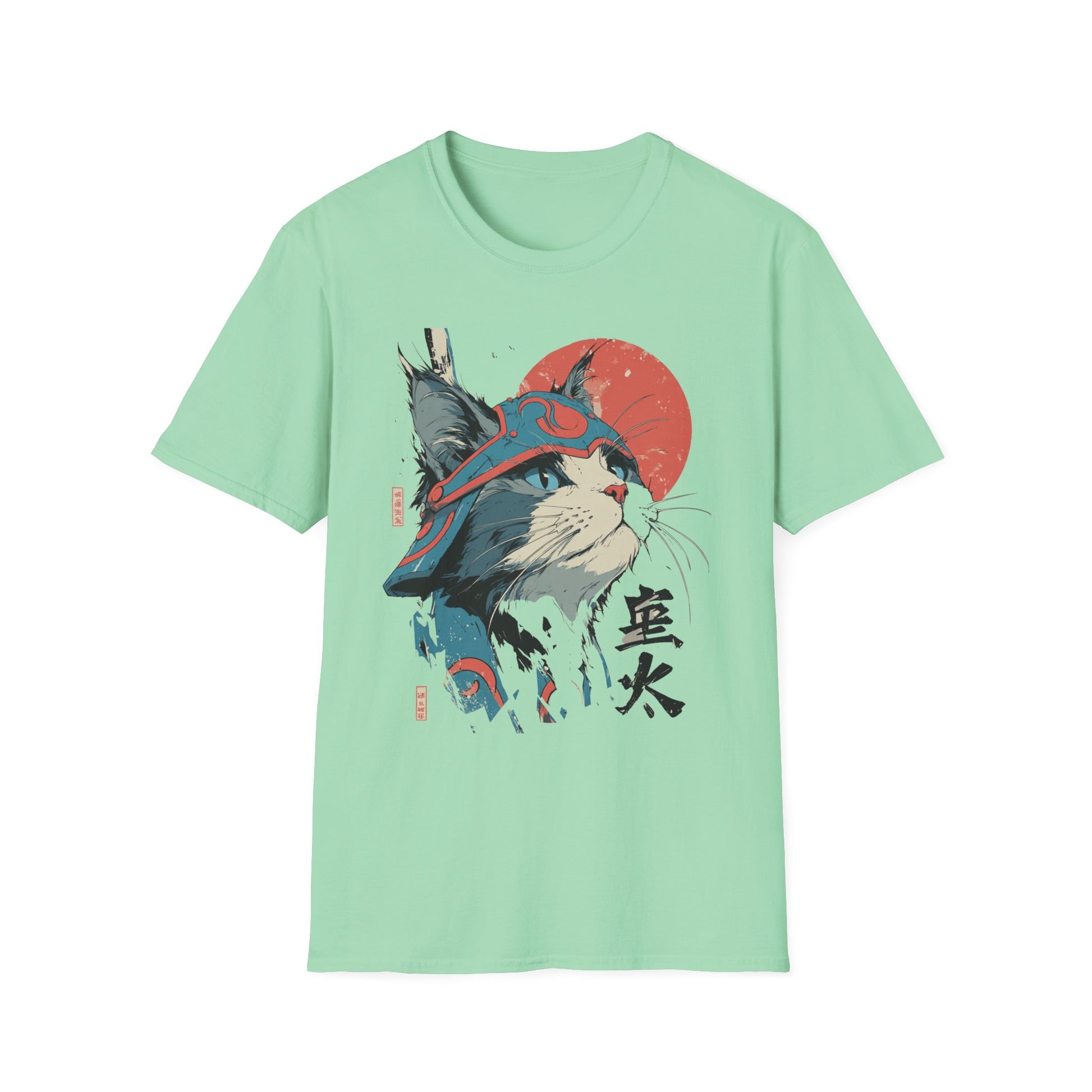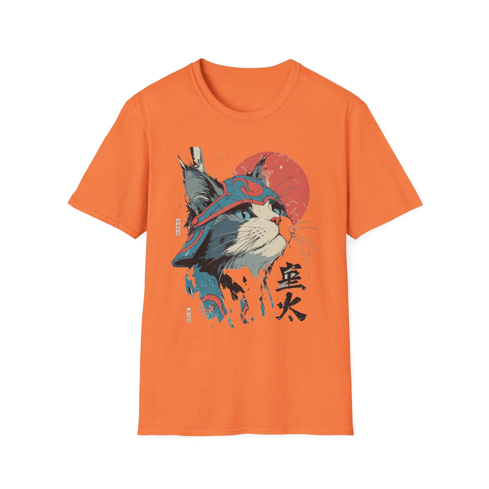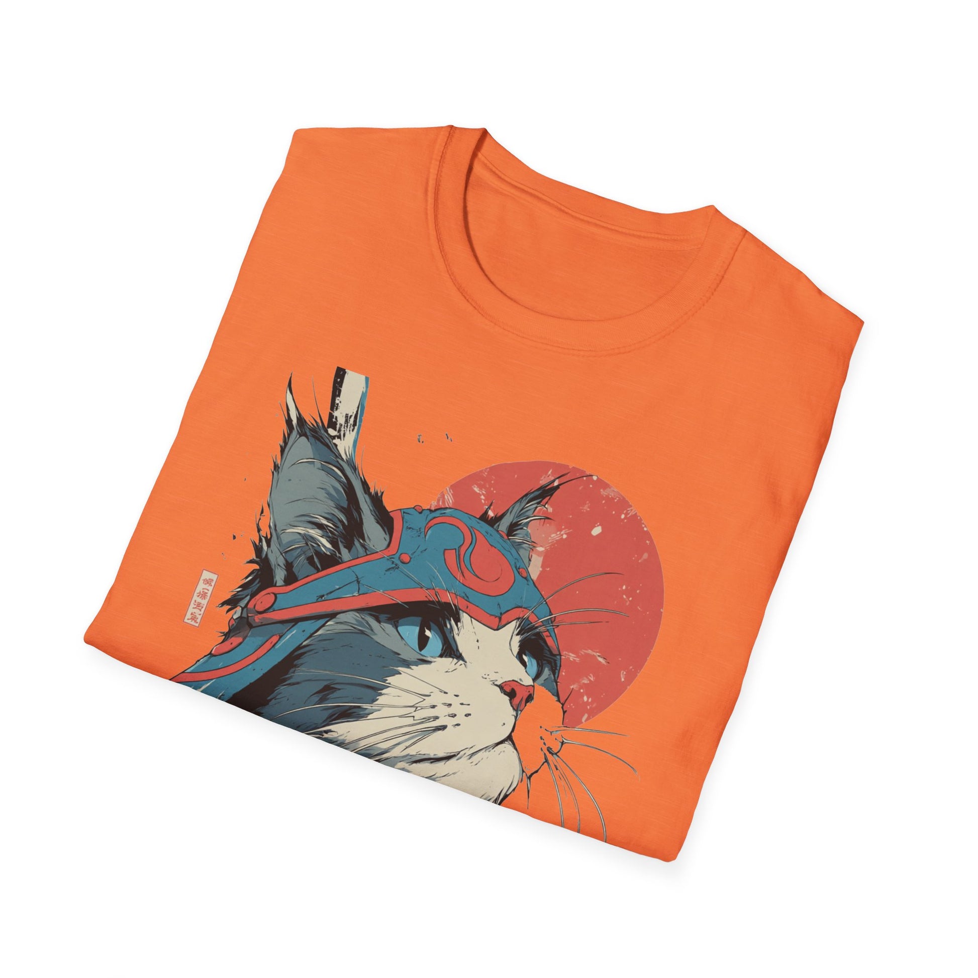 A lightweight, ring-spun cotton tee featuring a bold, samurai-inspired cat illustration—striking reds and muted teals set against a clean white canvas. The artwork pairs Japanese kanji and a rising sun motif with hand-drawn brush textures, creating a balance of playful charm and quiet strength. Wear it to add an artful, street-style edge to everyday outfits or to layer under a jacket for conventions, meetups, or casual nights out. The soft fabric and classic crew neck make it comfortable for long days while the tear-away label and reinforced shoulder tape keep the fit feeling fresh wash after wash.